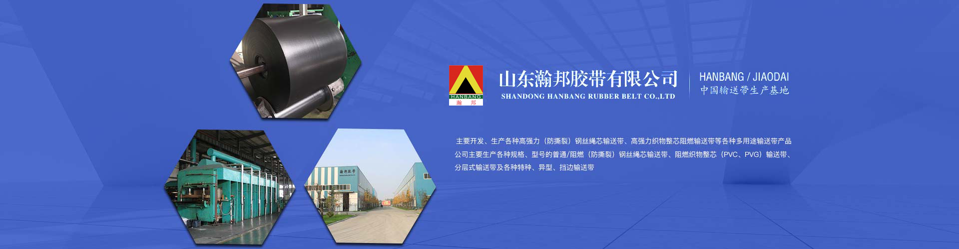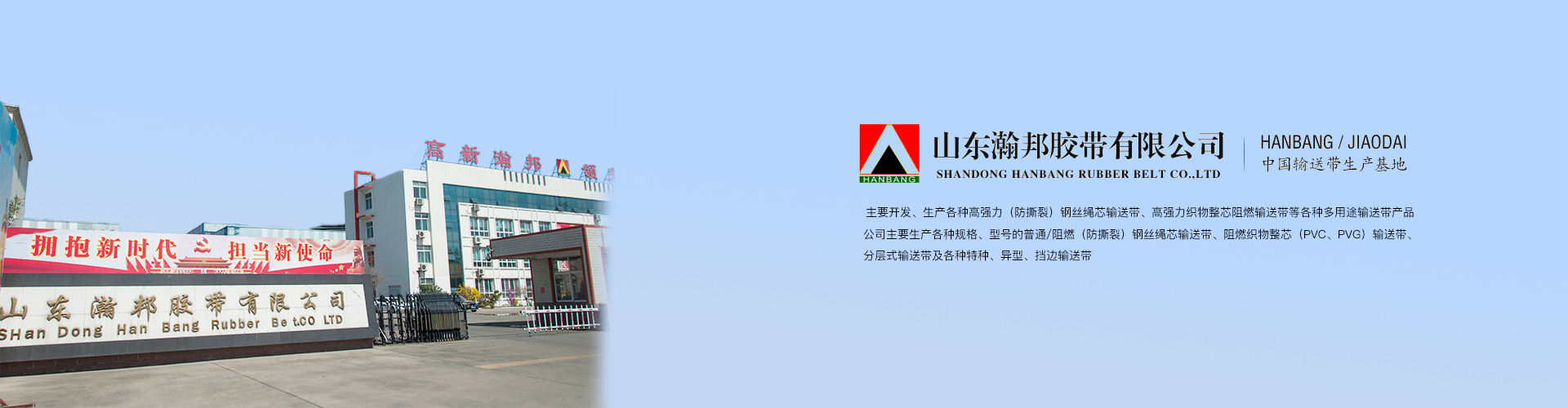 Shandong Hanbang Rubber Belt Co., Ltd..山东瀚邦胶带有限公司地处于齐鲁咽喉,九州古城之一--山东省兖州市,东临东方圣城、孔子故里--曲阜,南接中国荷都--微山湖,西仰中华武术之乡--水泊梁山,北依巍巍泰山。这里是中国三大煤炭生产基地之一,拥有肥硕的地下煤炭资源。 山东瀚邦建企于2007年1月13日,注册资金1.06亿元。拥有两个现代化生产管理厂区,是国内从事输送带产品设计、制造生产各种用途输送带的大型企业,公司占地面积90000多m2,建筑面积40000多m2,拥有在职员工900余人,其中各类高精尖、专业技术人才超过126人,公司固定资产3.1亿元,年生产能力可达到890万m2。2009年加入中国橡胶工业协会、山东省橡胶协会会员单位。公司建厂晚起点高,公司定位于高端产品,主要开发、生产各种高强力(防撕裂)钢丝绳芯输送带、高强力织物整芯阻燃输送带等各种多用途输送带产品,逐步发展为国内大型生产企业。